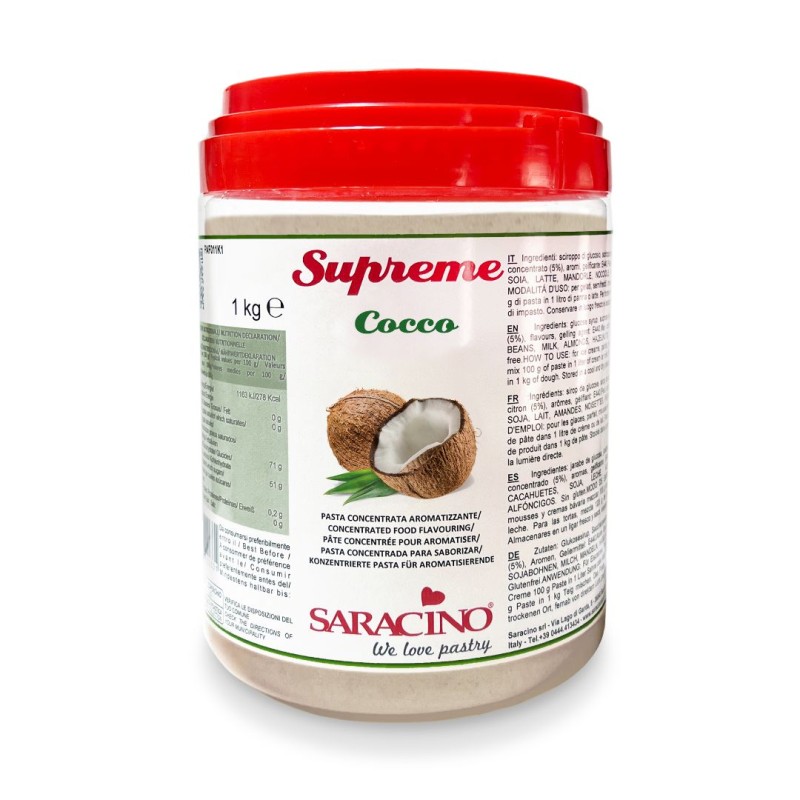 The flavoring pasta the supreme Saracino The taste of coconut is a natural concentrated pasta, which serves to aromatize mixtures, creams, bavarians, mousses and desserts in general. The coconut flavored pasta is presented in a 1 kg plastic bucket.
