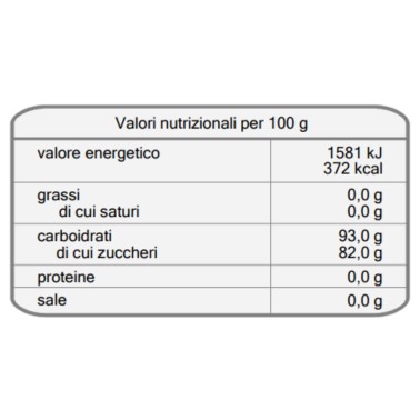 Nutritional value: Energy value 1581 KJ / 372 kcal, fat 0.0 g of which saturated 0.0 g, carbohydrates 93.0 g of sugars 82.0 g, protein 0.0 g, salt 0.0 g per 100 g.